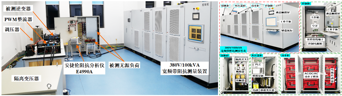 新能源发电装备宽频带阻抗测量及振荡抑制实验平台:平台主要由380V/100kVA宽频带阻抗测量装置、被测电力电子装备、隔离变压器等设备组成,可实现各工况下风力发电装备、光伏发电装备等新能源发电装备10Hz-1kHz宽频带阻抗特性实测。该实验平台可为宽频带阻抗测量方法有效性的验证、所建新能源发电装备的宽频带阻抗模型准确性的验证提供途径,能为新能源并网发电“把脉”、并为其宽频带振荡抑制技术提供指导。