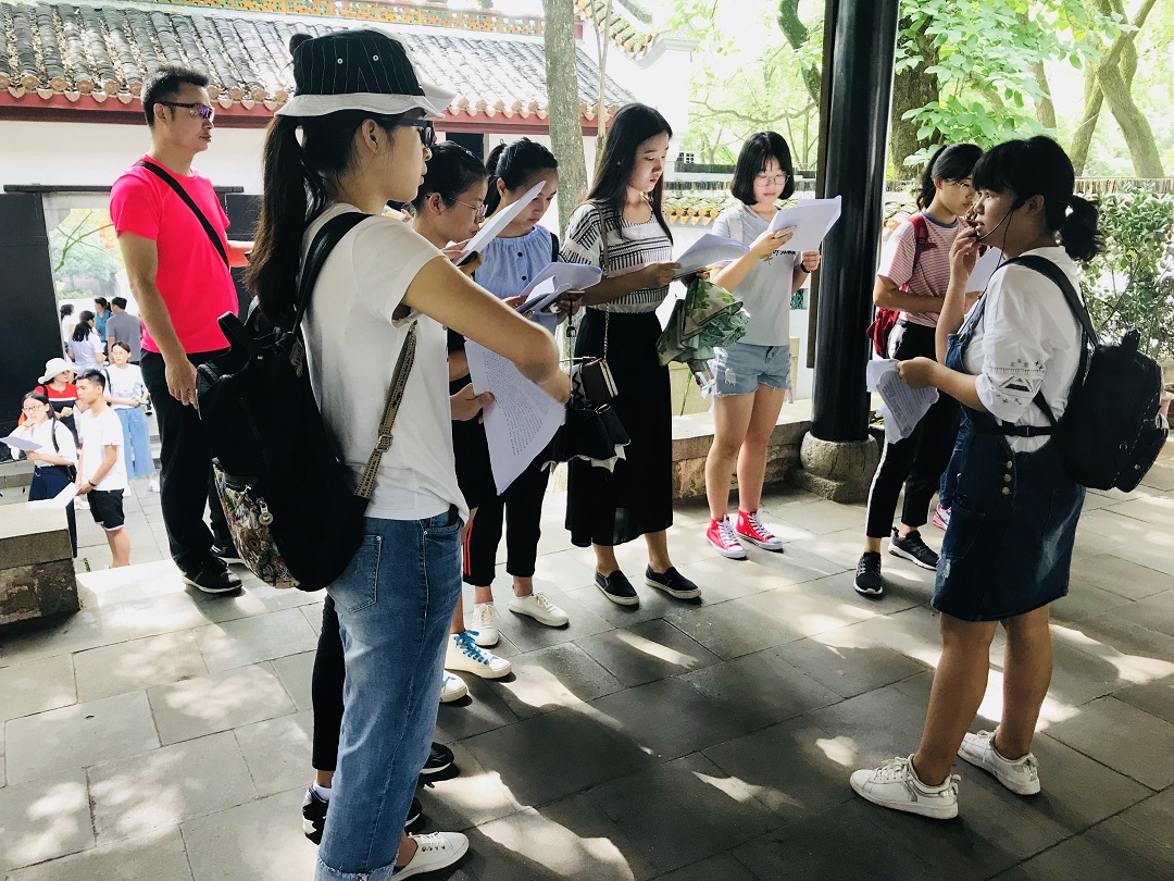培训时,志愿者们都一边聆听导游的讲解一边看着手中的讲解词。本次以书院中轴线为中心线,按石碑、赫曦台到大门二门、讲堂、御书楼的顺序进行培训讲解。除了讲解词上对景点的基本介绍外,导游还添加了其典故、出处、历史、历代变革或者篇外趣事。在讲解赫曦台时增添了墙上"寿"字和"福"字的来历,道大门匾额闻名天下的背景,详说"惟楚有材,于斯为盛"的内涵,其中导游们对门口的汉白玉抱鼓石进行了详细讲解,"门当""户对"这两个话题激发了大家的兴趣,同时也引来许多游客围观。一路的讲解吸引了不少游客,他们有的提出自己的疑问,有的分享自己的见解,为讲解过程带来许多乐趣。