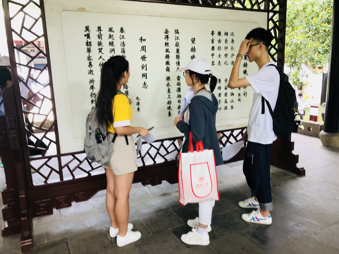 上午9:30,志愿者、参与培训工作的往届义务导游和工作人员在岳麓书院门口集合完毕,并留下了合影。本次的培训以小组的形式展开,整个培训过程有条不紊地进行着。当天天气炎热,周末的游客又比平时多了很多,使岳麓书院热闹而又繁忙起来。