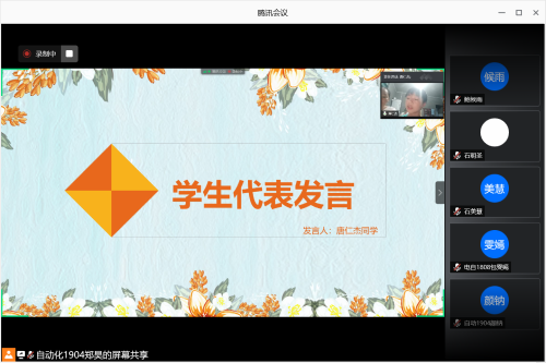 学子往年到靖州乡村支教的热闹场面。视频结束后,郑昊同学代表支教队队员承诺,尽管今年无法下乡实践,但他们仍可以在文化课上用一个网络、几台设备支撑出孩子们的学习天地;绘画课上一块白纸、几根铅笔描绘孩子内心的美好世界;科技课上科普高科技知识,吸引孩子们的目光、点燃孩子们对高新科技的向往……寓教于乐、教学相长是“三下乡”支教的特色,能够看到孩子们对新科技向往的眼神,听到孩子们的读书声、讨论声、欢笑声,感受到孩子们身上洋溢的少年活力,是老师们的心愿;郑昊同学又说到会尽己全力与孩子们续写“三下乡”的辉煌历程,给孩子们带来充实丰富的线上教学。