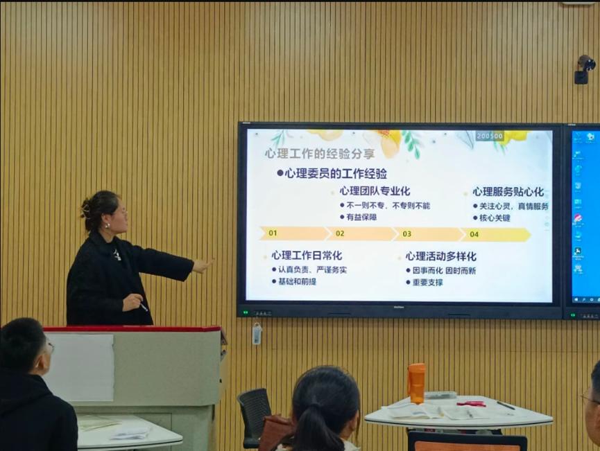 心理纪律股股长蒋蒙蒙向各位心理委员介绍了心理纪律股的相关部门理念及工作制度的解答,并且宣布了近期的工作任,帮助各班心理委员更好的了解了心理纪律股部门管辖内容和主要管理制度要求。期间,各心理委员主动积极提出各种问题和经验进行工作交流,极大促进了心理纪律股部门发展。