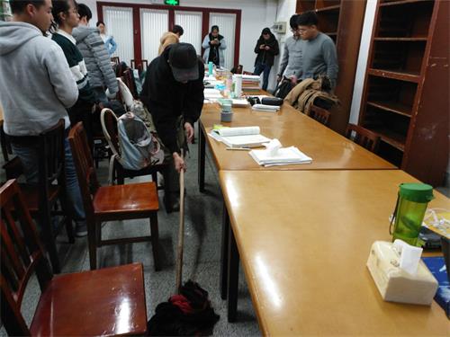 到达六楼后,负责人老师首先表达了对志愿者们的感谢之情,然后开始分配任务,男生负责拖地,女生负责整理书架。在老师分发工具之后,志愿者们有条不紊的开始了各自的工作,一切井然有序,整个过程志愿者们都注意要保持安静,不对正在自习的学生造成困扰。很快所有的任务都圆满完成,负责人老师在向所有的志愿者们表达了谢意之后,志愿者们便经过班委同意后解散。