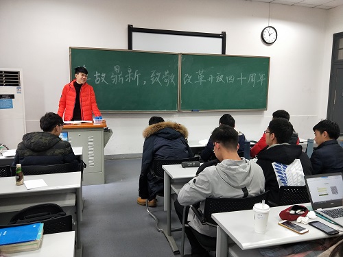 最后,各个寝室的代表也分别上讲台展示本组成员交流的改革开放成果,他们在改革开放四十年来民众生活、玩具形式、政策变革等方面各抒己见,拓宽了同学们的知识面,也让大家更好的体会到改革开放给我们带来的福音。