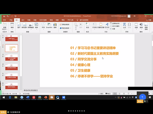 接着张雨藤简谈了《新时代爱国主义教育实施纲要》,并将其文件发送至班级QQ群,同学们在会议期间畅谈自己学习后的所思所感。随后,张雨藤提出“在这次疫情中,作为青年的我们,该如何坚定爱国力行的使命责任?中国社会主义制度的优势体现?”等一系列问题,同学们纷纷打开摄像头,面对面的展开交流与讨论,其中入党积极分子兼宣传委员余钟怡分享了自己关于青年担当的看法和行动,号召大家作为当代青年,一起自觉承担起责任与使命。