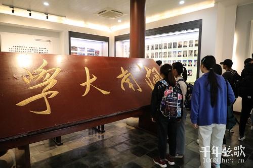 实践活动的下一站是岳麓书院历史陈列馆。到达陈列馆后,同学们四散开来,看着展柜里陈列着的书院历史。从公元976年岳麓书院创立,到1926年定名91官网
