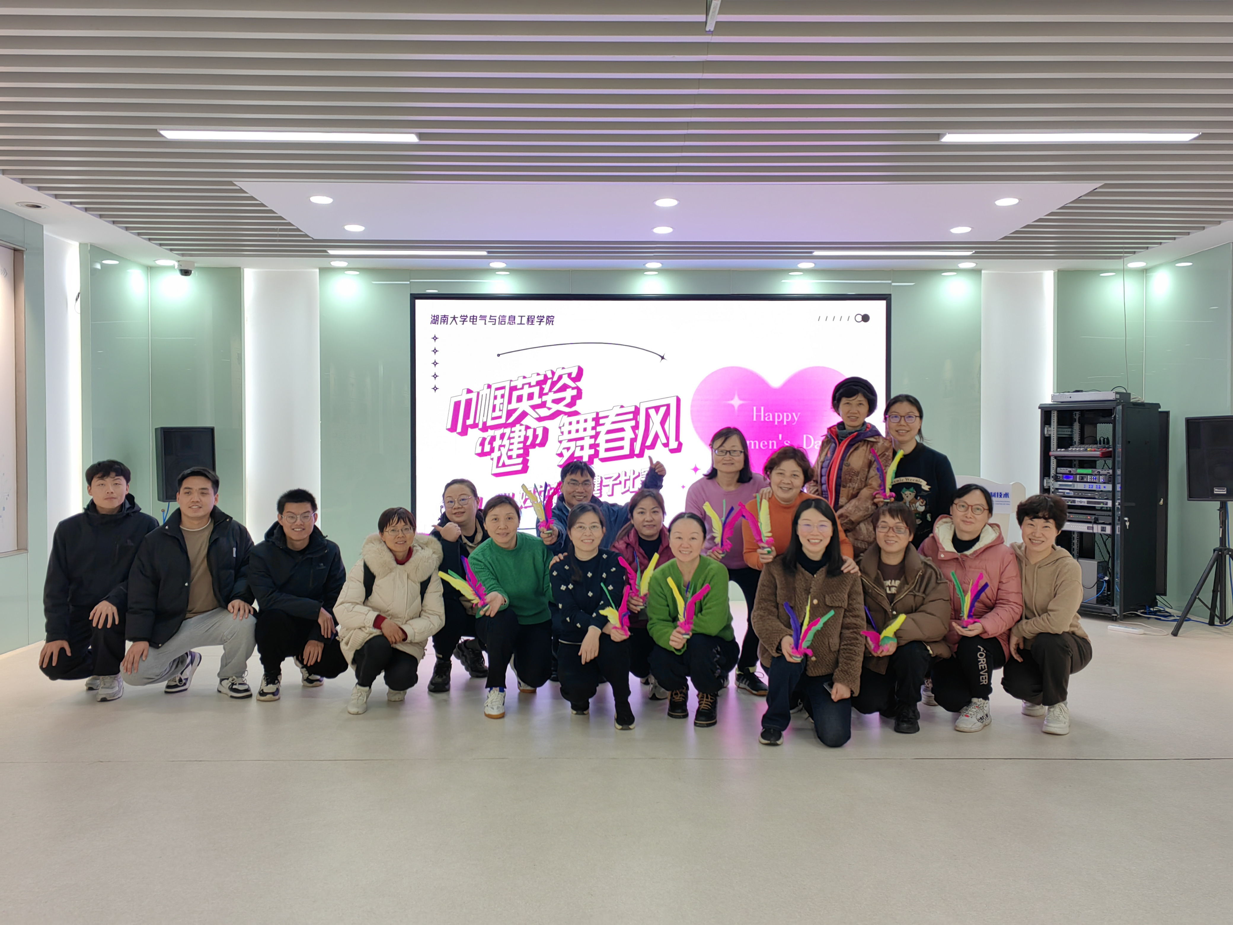 代表队在女工委员陈洁平老师的带领下参加学校教职工趣味闯关比赛,全体队员团结一心,全力配合,在全校30多个代表队中,取得了第三名的好成绩。与此同时,学院“巾帼英姿 ,‘毽’舞春风”三八妇女节踢毽子比赛在机器人视觉感知与控制技术国家工程研究中心大厅精彩开赛。经过一个多小时的比拼,陈洁平、李玉翠、岳秀梅老师分别获得前三名。