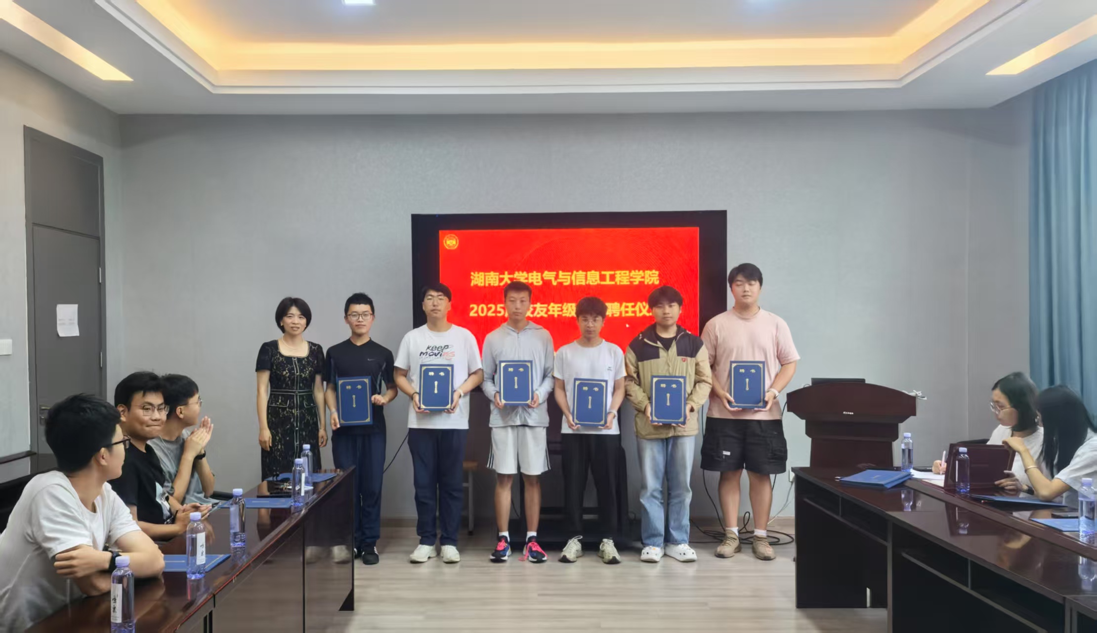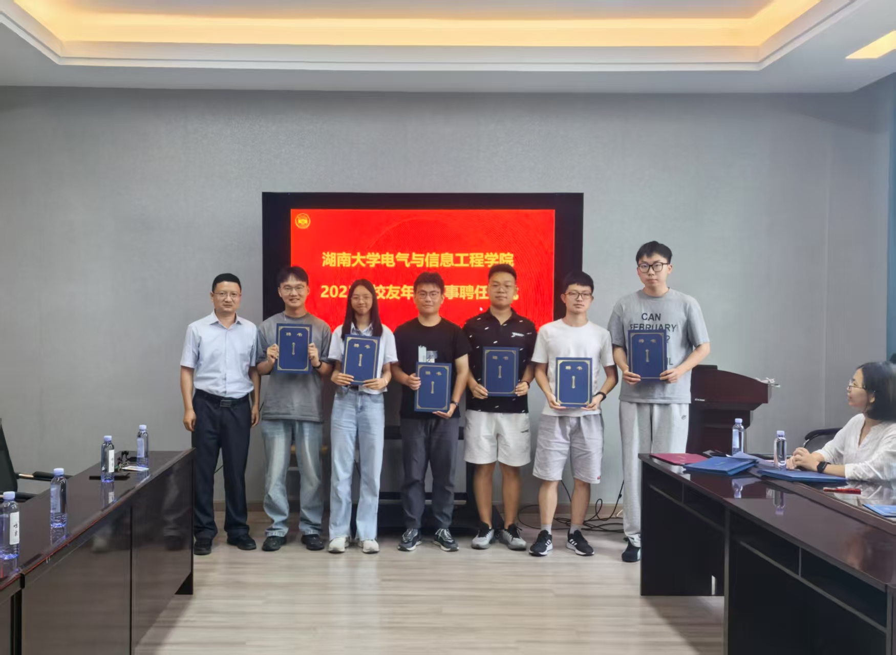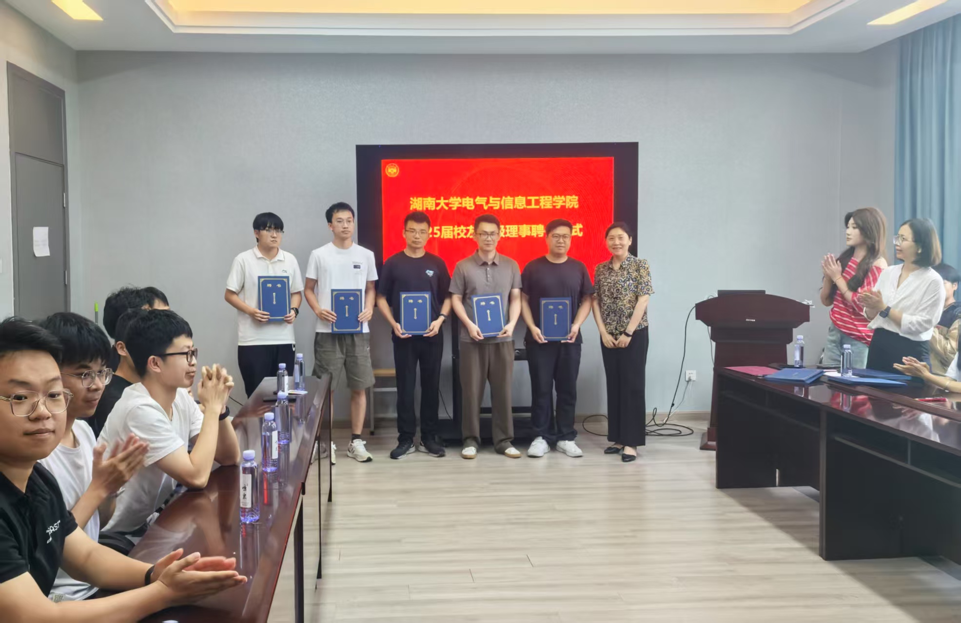 会议的核心环节——校友年级理事聘任仪式随后举行。学院领导共同为2025届校友年级理事代表颁发了聘书。聘任校友年级理事是学院加强校友工作网络建设、维系毕业生与母校情感纽带的重要举措,旨在充分发挥他们在联络同窗、服务校友、支持学院发展中的桥梁纽带作用。仪式结束后,与会领导与新任年级理事合影留念,共同记录下这一庄重而富有意义的时刻,标志着2025届毕业生作为新校友与学院深厚情谊的延续。