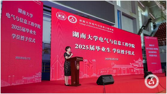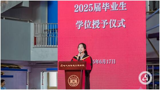 优秀本科毕业生代表郭伊可发言,她以“短短一行”的简历为引,分享大学四年的成长感悟。她强调专业根基是未来前行的基石。她感念珍贵的师生情谊,肯定同窗们在各种赛道的亮眼表现。此外,她提出毕业生应牢记“实事求是,敢为人先”的校训,将个人奋斗融入国家伟业,在中国式现代化征程中彰显湖大电气人的担当。