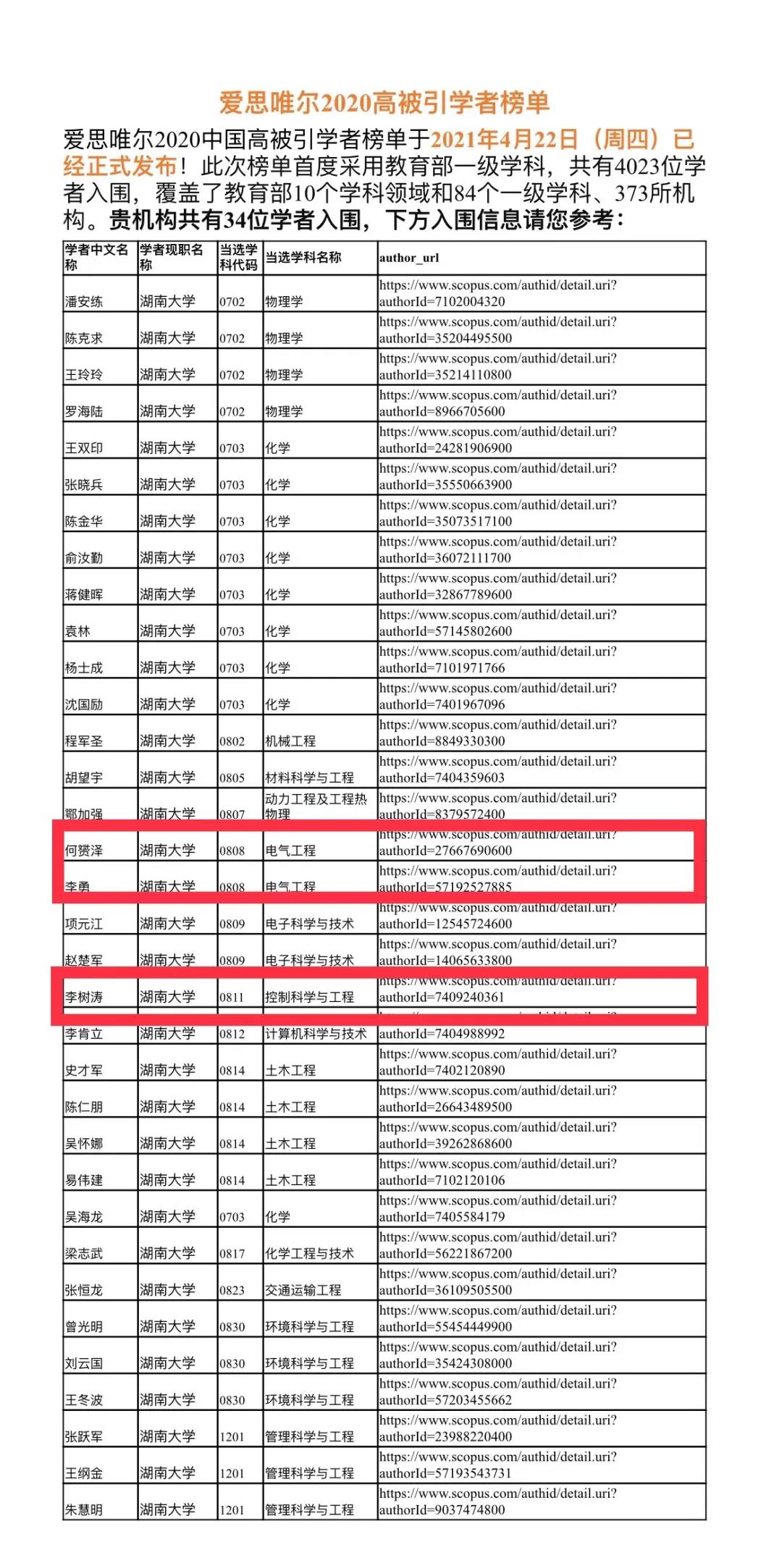 2021年4月22日,爱思唯尔2020中国高被引学者榜单正式发布!此次榜单首度采用教育部一级学科,共有4023位学者入围,覆盖了教育部10个学科领域和84个一级学科、373所机构。91官网 共有34位学者入围,91官网 的何赟泽老师、李勇老师、李树涛老师荣登此榜。特此报喜!